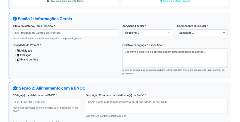 Crie prompts alinhados à BNCC, adaptados por objetivo pedagógico e nível cognitivo, com a possibilidade de salvar, editar e reutilizar seus próprios modelos.